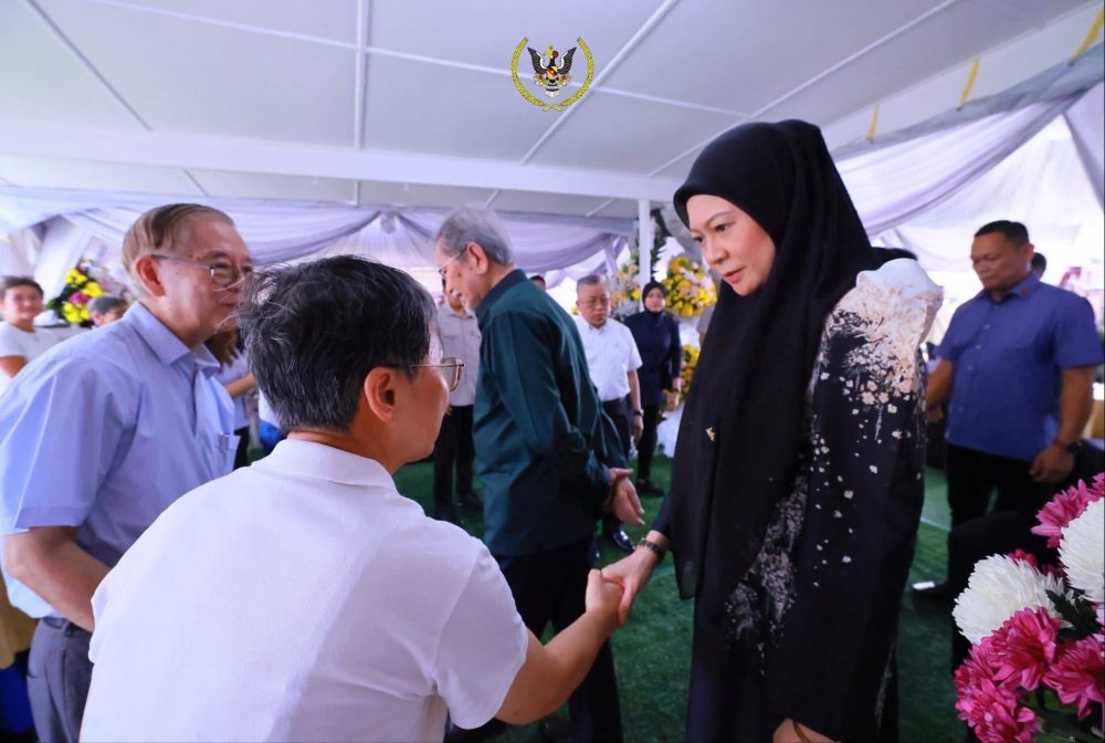 KUCHING: Tuan Yang Terutama Yang di-Pertua Negeri Sarawak, Tun Pehin Sri Dr Wan Junaidi Tuanku Jaafar bersama isteri, Toh Puan Datuk Patinggi Fauziah Mohd Sanusi berkenan memberikan penghormatan terakhir kepada mendiang Datin Patinggi Puan Sri Dr Jane Yong Sau Kan di kediaman keluarga di Jalan Tabuan, di sini, petang tadi.