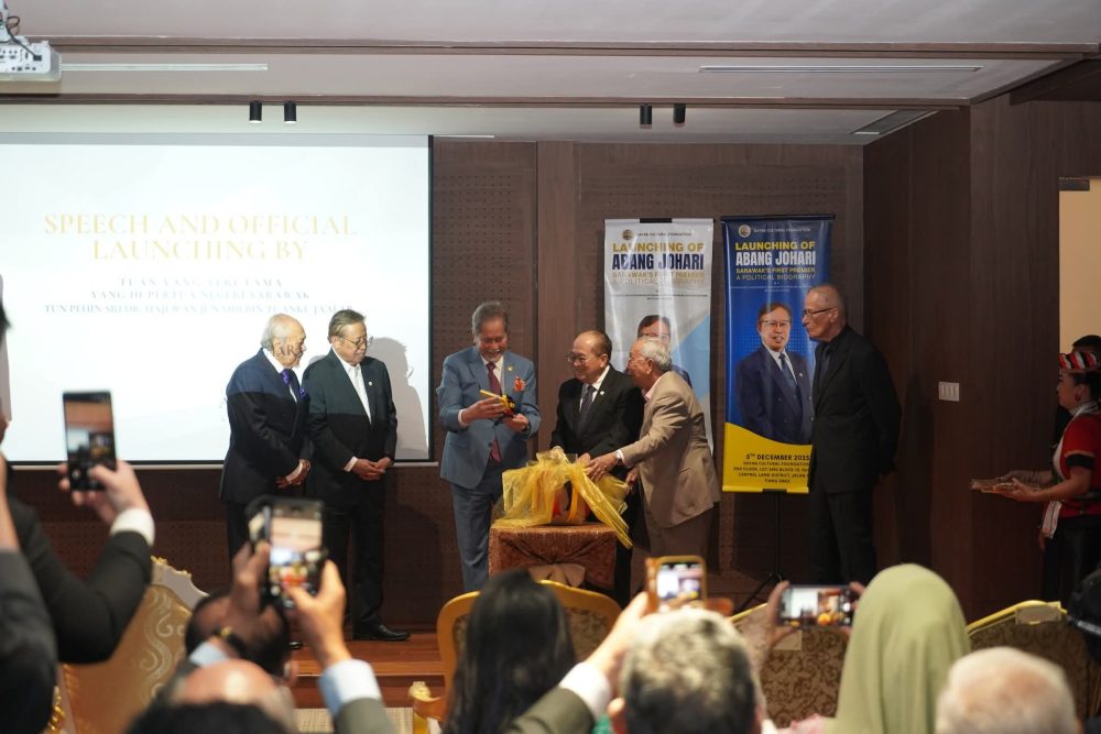 YAYASAN Kebudayaan Dayak (DCF) melancarkan biografi rasmi mengenai legasi politik Premier pertama Sarawak, Datuk Patinggi Tan Sri Abang Johari Tun Openg, semalam. Foto Pejabat Timbalan Premier