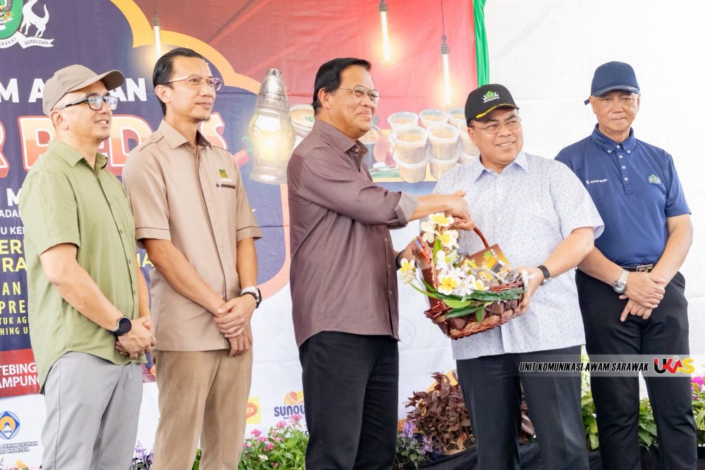 TIMBALAN Menteri Di Jabatan Premier Sarawak (Penyelaras Projek Bagi Agensi Pembangunan Wilayah, DBKU Dan Hal Ehwal Islam) Datuk Dr Abdul Rahman Junaidi pada Majlis Agihan Bubur Pedas Kejiranan Mesra DBKU di Tebingan Sungai BGS, Kampung Sourabaya Ulu, hari ini. Foto UKAS