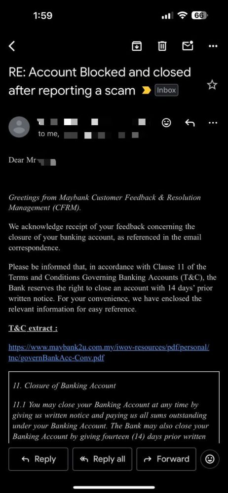 However, what followed was unjust. Instead of being treated as a victim, Mr Sim’s Maybank account was flagged and later closed under Clause 11 of the bank’s Terms and Conditions Governing Banking Accounts, which allows the bank to close any account with 14 days’ notice.