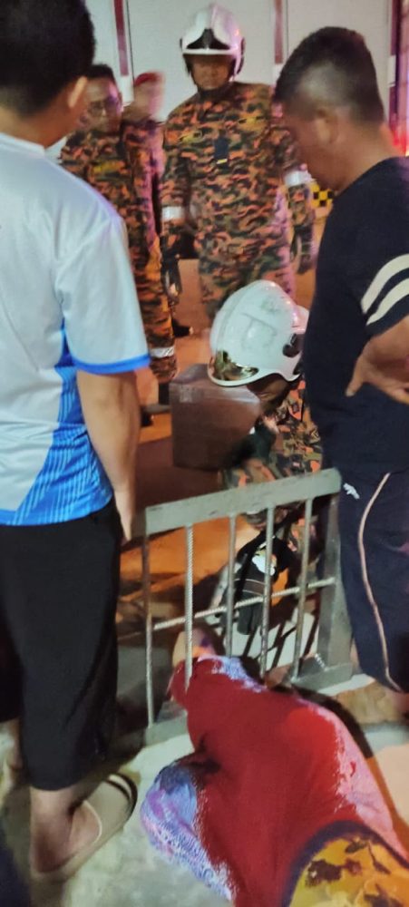 TERSEPIT… Anggota bomba mengeluarkan kaki mangsa yang tersepit di celah besi penutup longkang di Jalan Sirih, malam tadi. Foto BBP Sarikei