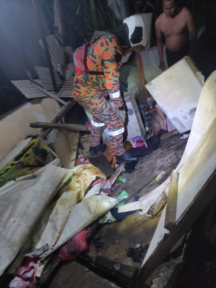 Komander operasi, PBK II (TBK I) Asmadi Nawi berkata, sebaik tiba pada 3.43 pagi, pasukan mendapati berlaku runtuhan di bahagian dapur rumah kampung berkenaan dan terdapat seorang mangsa wanita terjatuh di kawasan runtuhan.