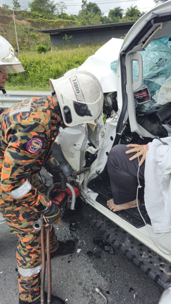 Katanya, pasukan bomba kemudian menjalankan kerja-kerja menyelamat menggunakan peralatan khas bagi mengeluarkan mangsa yang tersepit.