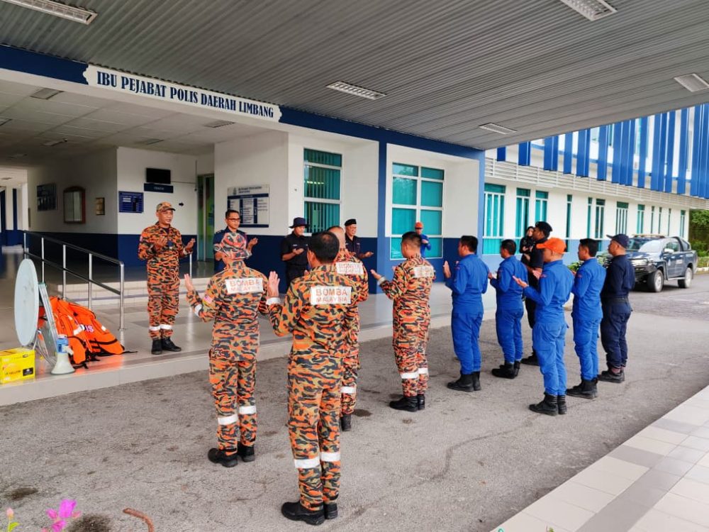 TAKLIMAT OPERASI… Anggota bomba yang terlibat dalam operasi SAR di Long Napir menghadiri taklimat disusuli doa untuk keselamatan. Foto BBP Limbang