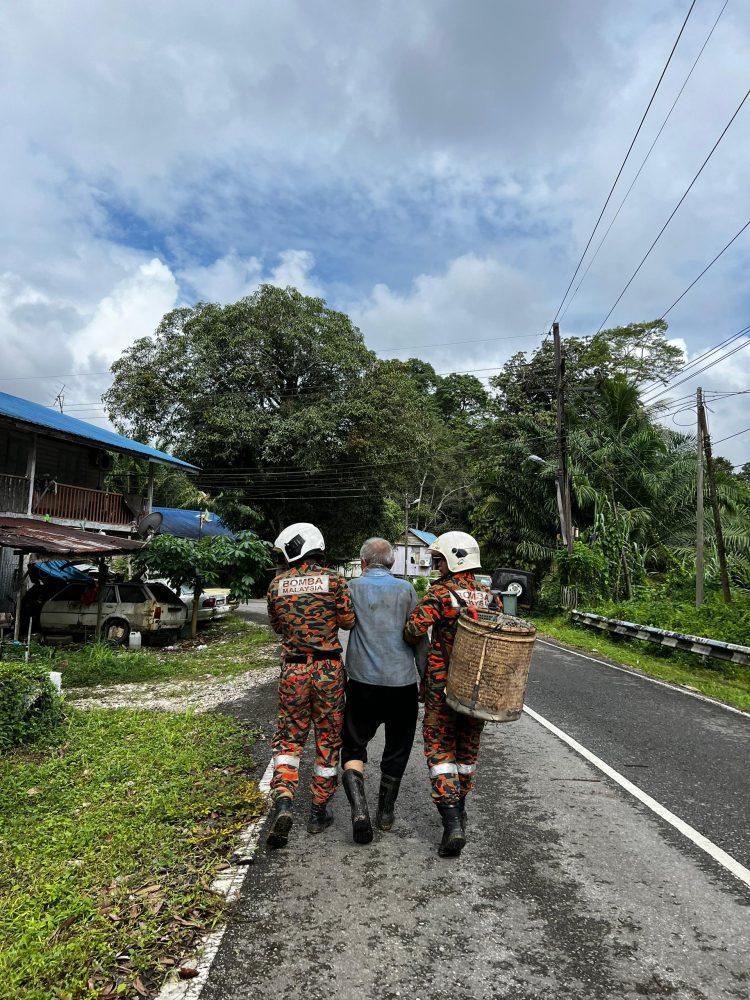 “Pasukan bomba bertindak menurunkan mangsa dengan selamat sebelum membawa mangsa keluar dari kawasan kebun menuju ke rumahnya.