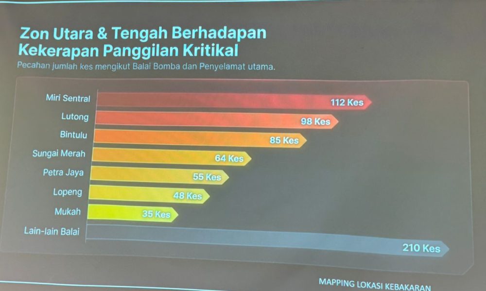 Menurut JBPM, data pecahan kes mengikut balai utama menunjukkan Balai Bomba dan Penyelamat (BBP) Miri Sentral merekodkan jumlah tertinggi dengan 112 kes, diikuti Lutong sebanyak 98 kes dan Bintulu dengan 85 kes.
